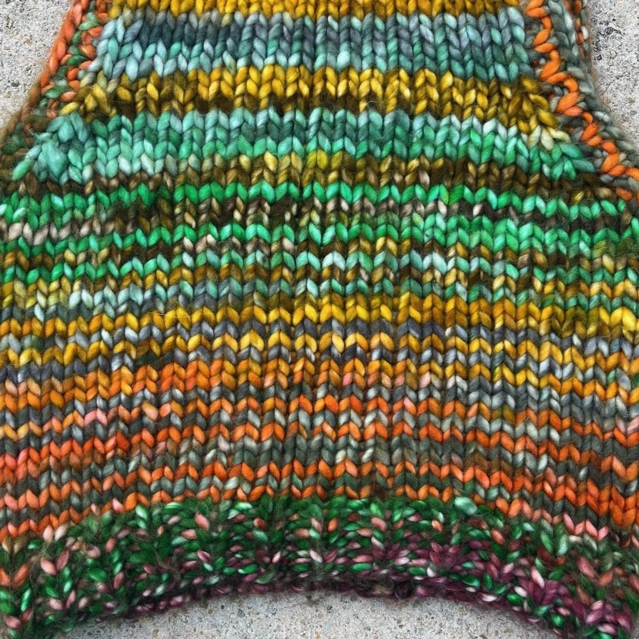 I designed this sweater to make good use of one of those colorways, as well as the chunky texture of the wool. I love how the colors play against each other.